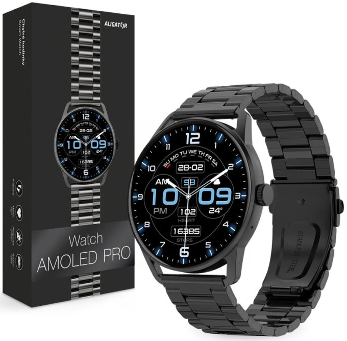 Chytré hodinky Aligator AMOLED PRO nabízejí elegantní kovové tělo, přehledný AMOLED displej s funkcí Always-On a možnost telefonování přímo ze zápěstí. Sledují zdraví i sportovní aktivity, zobrazují notifikace z telefonu a potěší výdrží až 7 dní.