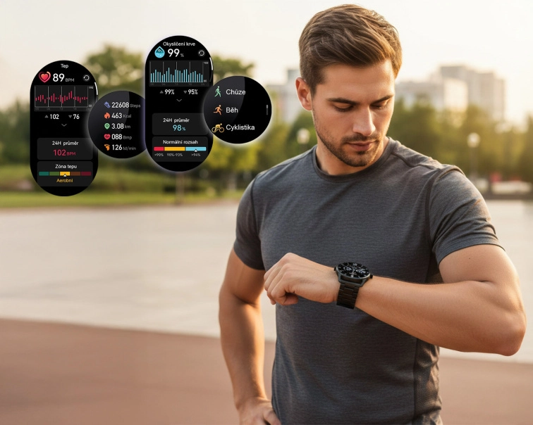 Hodinky měří kroky, kalorie, tep, spánek, stres i okysličení krve (SpO₂). Tyto údaje slouží pro základní přehled o vaší kondici a životním stylu – užitečný pomocník, který napoví, kdy zpomalit a kdy naopak přidat.
