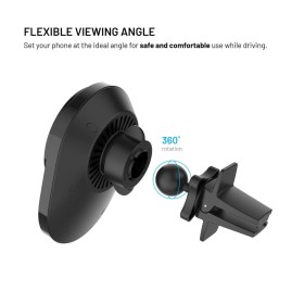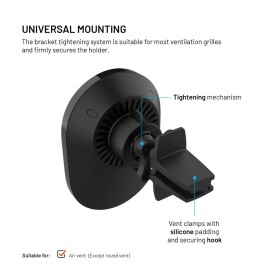 Montáž držáku je snadná – pomocí klipu se zpětným háčkem jej bezpečně upevníte do ventilační mřížky. Otočný 360° kloub umožní nastavit telefon přesně tak, jak potřebujete, a díky promyšlené konstrukci zůstává přístup k ovládacím tlačítkům i konektorům telefonu volný.