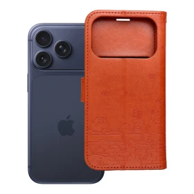 Flipové pouzdro MEZZO s lisovaným vzorem pro mobilní telefon Apple iPhone 17 Pro. Krásný vzor koček v hnědé barvě vás svým vzhledem nadchne. Vzor na rozdíl od většiny případů tohoto typu designu, nebyl namalován ani potištěn, ale vlisován do materiálu lisem, díky čemuž je odolný, neodírá se a povrch krytu se vyznačuje měkkým, nerovným povrchem, který lze cítit pod prsty. Povrch obalu je z ekokůže dodává mu elegantní vzhled, flexibilní TPU vložka usnadňuje instalaci zařízení do pouzdra.