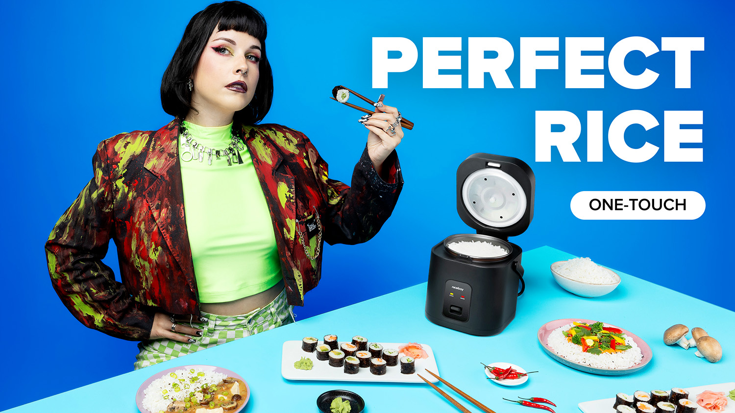 Už žádná rýže z pytlíku. Rýžovar Niceboy RiceCooker POP ti za 25 minut připraví krásně nadýchanou rýži k masu, omáčce nebo do sushi. Stačí stisknout jedno tlačítko a on už se o všechno postará za tebe.