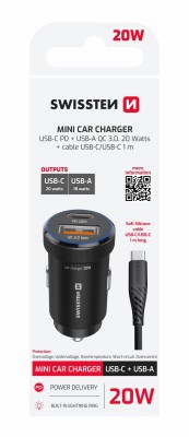 Kvalitní Swissten CL Adaptér USB-C PD + USB-C s výkonem 20W a přiloženým soft silicone kabelem je nepostradatelným doplňkem pro každého, kdo tráví čas za volantem a potřebuje mít své mobilní zařízení vždy v plné pohotovosti.