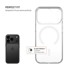 Pouzdro disponuje integrovanými MagSafe magnety pro přesné a stabilní uchycení k nabíječkám a dalšímu MagSafe příslušenství. Transparentní materiál přirozeně odolává žloutnutí a lehce zvýšené hrany v oblasti fotoaparátu a displeje chrání před případným poškrábáním.