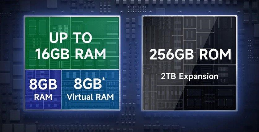 O plynulý chod se stará 8GB RAM, kterou lze rozšířit až o dalších 8 GB virtuální paměti. Uložiště činí 256 GB, a pokud by to nestačilo, je možné ho doplnit o TF kartu až do kapacity 2 TB. To vše běží na moderním Androidu 14, který přináší rychlejší animace, inteligentní správu aplikací a vyšší úroveň zabezpečení dat.
